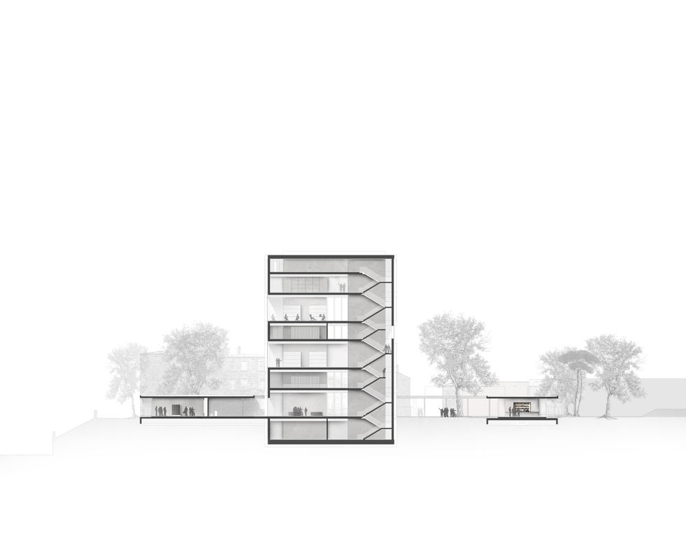 u-shaped building at this location, providing the site with a center, the new design incorporates an enclosing arcade under whose roof the exhibition and visitor pavilions nestle. slightly off-center stands the tower, which houses eileen gray’s concentrated work. It serves as a link between archiving and studying, combining archive storage and workspaces with a show archive and a library. the tower also references eileen gray’s work and acts as a guidepost for the site. the freestanding pavilions allow for a thoroughfare throughout the entire complex and connect the two historic squares.